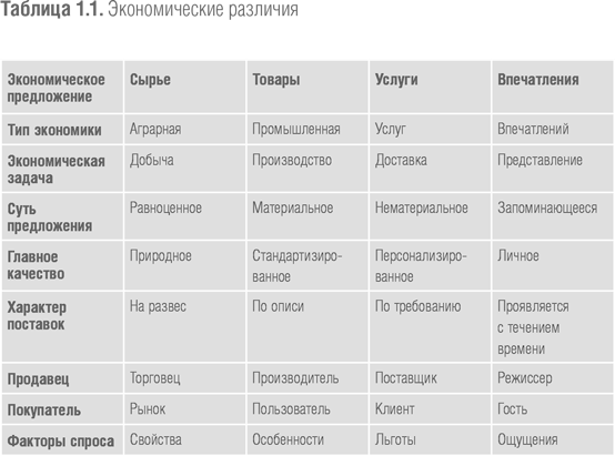 Почему это происходит именно сейчас? Отчасти из-за новых технологий, делающих возможными множество новых впечатлений, а отчасти из-за обостряющейся рыночной конкуренции, которая вынуждает компании искать все новые и новые пути привлечения покупателей. Однако самый полный ответ заключен непосредственно в сути потребительской ценности, в ее естественной эволюции – как мы рассматривали на примере кофейных зерен – от сырья к товарам, к услугам и, наконец, к впечатлениям. Еще, разумеется, на становление экономики впечатлений повлиял рост уровня благосостояния. Экономист Тибор Сциковский отмечает, что, «по всей видимости, улучшение материального положения находит свое отражение, в первую очередь, в праздничных застольях; люди организовывают их все чаще и чаще, пока они не становятся частью их обычной жизни, например в форме "воскресных ужинов"»[10]. Это справедливо и для впечатлений, за которые мы платим. Мы будем чаще есть там, где нам предлагают больше впечатлений, и даже пить больше «праздничного» кофе. Как показано в таблице 1.1, каждое экономическое предложение существенно отличается от остальных; в частности, каждый последующий уровень повышает потребительскую ценность предложения. Часто какой-нибудь руководитель заявляет, что его компания «занимается сырьевым бизнесом», в то время как в действительности продукцию, которую они предлагают, отнюдь нельзя назвать сырьем. Отчасти это восприятие вызвано уценкой, которая происходит всякий раз, когда компания не способна понять разницу между сырьем в чистом виде и ценным рыночным предложением. (А если эксперт или аналитик утверждает, что ваша компания торгует сырьем, хотя в действительности это не так, с одной стороны, это вас обижает, а с другой – побуждает перейти на более высокий уровень рыночного предложения.) Если вы боитесь, что ваше рыночное предложение все больше становится похожим на предложение сырья, прочтите приведенное ниже краткое описание каждого вида экономического предложения. Если же вы полагаете, что этого никогда не произойдет, задумайтесь еще раз: подобная надменная уверенность предшествует, как правило, большому падению (цен).