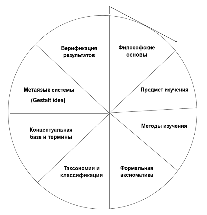 Мне представляется, что любая зрелая наука должна иметь восемь слагаемых – на схеме они включены в круг. Она опирается на философское обоснование науки: зачем она нужна, как сочетается со смежными направлениями, каковы её предстоящие близкие и дальние перспективы.