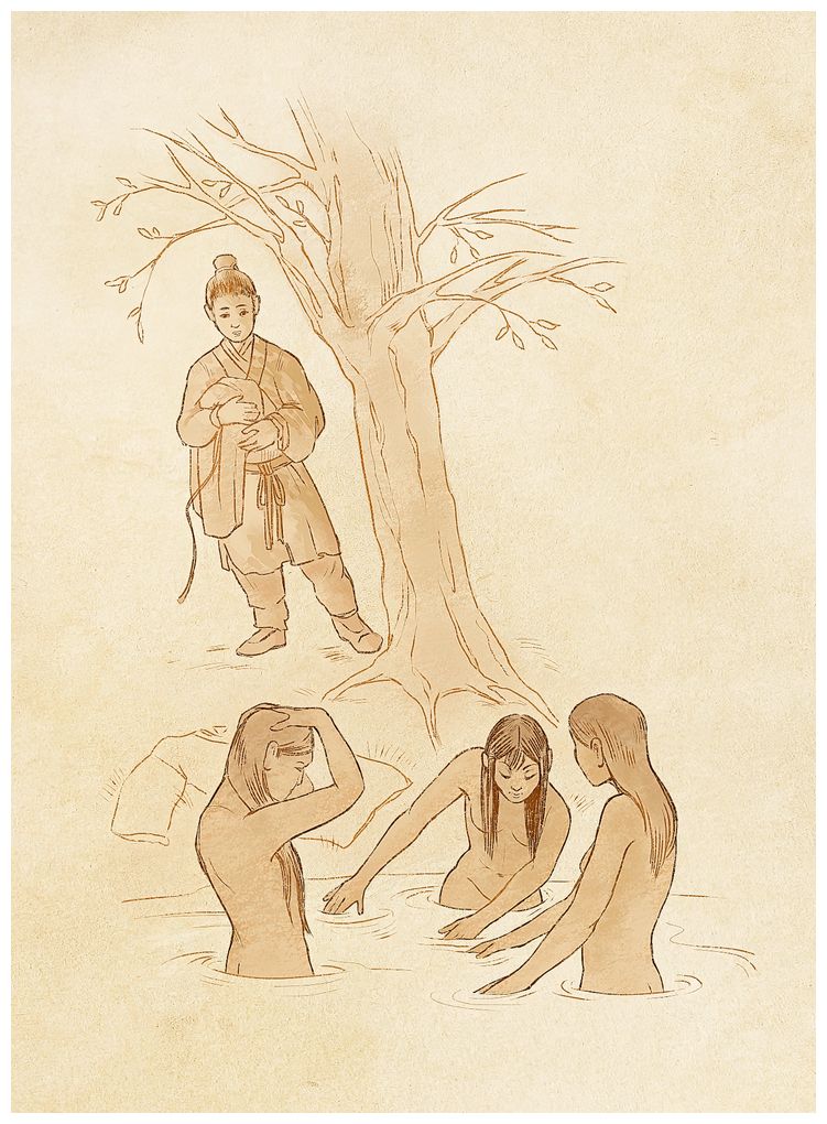 Ню-лан был бедным пастухом, который похитил платье Ткачихи, когда небесные девы купались, спустившись в мир людей (мотив, характерный для сюжета о лебединой деве, – см. также Гухо). Она не могла вернуться на небо без своего волшебного платья и согласилась выйти замуж за Волопаса. Супруги зажили счастливо, у них родилось двое детей. Затем Ткачиху насильно вернули на небо, чтобы она продолжила ткать драгоценную небесную парчу, и Волопас не смог ее догнать: путь ему преградила Серебряная река (Млечный Путь). Раз в году, в седьмой день седьмого лунного месяца, Ткачиха и Волопас встречаются над Серебряной рекой на мосту из сорочьих хвостов.