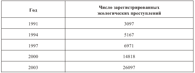 Удельный вес экологических преступлений в общем количестве зарегистрированных в России преступлений вырос с 0,3% в 1990 г. до 0,9% в 2003 г.