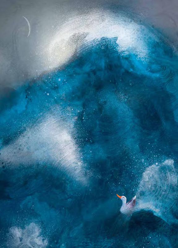 Но вот птицу разбудил оглушительный треск. Кто-то маленький, но решительный по ту сторону яичной скорлупы стукнул по ней несколько раз пока ещё непослушным клювом и пробил себе путь наружу. Это был детёныш утки. Победивший свою скорлупку, он был ещё слишком мал и слаб, чтобы плавать одному в этом страшном океане. Птенец пищал и тянулся к своей утке. Тогда она спрятала его под крылом и стала тихонько качать на мягких покатых волнах.