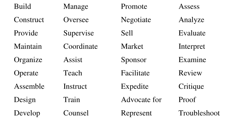 A wide variety of skills is required for almost any job, anything from taking instructions to giving them, from being supervised to supervising. In order to signal what you can do and what you have done, it is useful to think of your skills and experience in terms of action verbs.