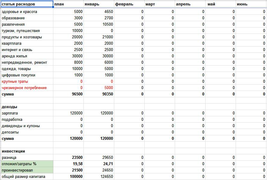 Если у вас есть долги, то заведите под них отдельный лист. Сумма долга должна сокращаться. Приоритет на погашение долгов выше, чем затраты на инвестирование.