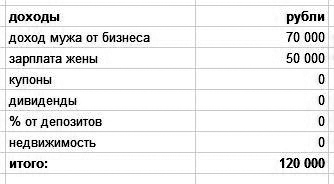 Привожу пример для семьи из двух человек. Здесь нужно внимательно следить за тем, чтобы увеличивались все статьи: зарплата – по возможности, дивиденды, купоны и депозиты – обязательно.
