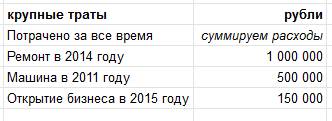 Мы вносим траты при помощи прибавления числа к отдельной расходной статье. Я считаю, что “портянка” из списка трат бесполезна: на ее основе нельзя сделать никаких выводов. Для анализа подходит только табличная форма.