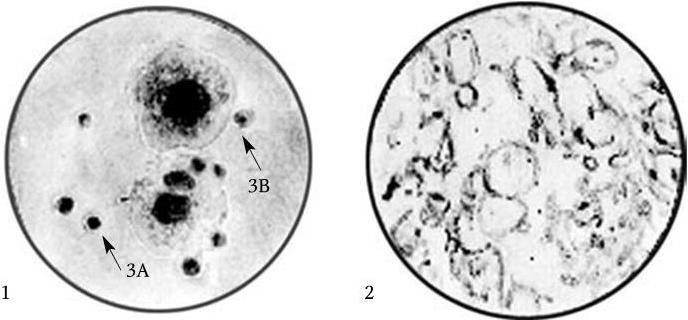 1 – колонии L-форм типа 3А и 3В; 2 – пузыревидные, грушевидные и субмикроскопические элементы L-форм дифтерийной палочки