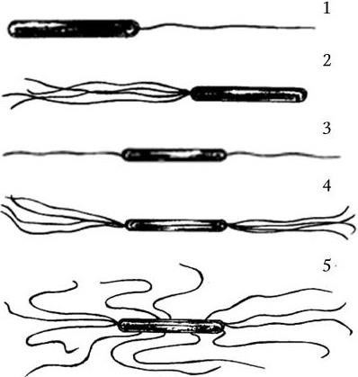 Жгутик состоит из однотипных спиралевидно или продольно уложенных вокруг полой сердцевины белковых субъединиц, образующих цилиндрическую структуру, которая особым образом прикреплена к бактериальной клетке. По характеру расположения жгутиков и их количеству подвижные бактерии условно делят на четыре группы (рис. 11):