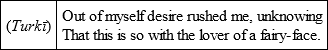 In those leisurely days I discovered in myself a strange inclination, nay! as the verse says, ‘I maddened and afflicted myself’ for a boy in the camp-bazar, his very name, Bāburī, fitting in. Up till then I had had no inclination for any-one, indeed of love and desire, either by hear-say or experience, I had not heard, I had not talked. At that time I composed Persian couplets, one or two at a time; this is one of the them: —