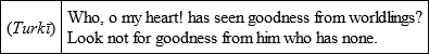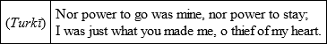 May none be as I, humbled and wretched and love-sick;No beloved as thou art to me, cruel and careless.From time to time Bāburī used to come to my presence but out of modesty and bashfulness, I could never look straight at him; how then could I make conversation (ikhtilāt̤) and recital (hikāyat)? In my joy and agitation I could not thank him (for coming); how was it possible for me to reproach him with going away? What power had I to command the duty of service to myself?501 One day, during that time of desire and passion when I was going with companions along a lane and suddenly met him face to face, I got into such a state of confusion that I almost went right off. To look straight at him or to put words together was impossible. With a hundred torments and shames, I went on. A (Persian) couplet of Muḥammad Ṣāliḥ’s502 came into my mind: —