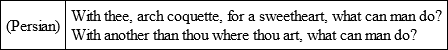 Said I, “Compose on these lines”;1574 whereupon those given to versifying, did so. As jokes were always being made at the expense of Mullā ‘Alī-jān, this couplet came off-hand into my head: —
