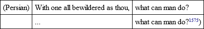 There were several verse-makers on the raft, such as Shaikh Abū’l-wajd,1572 Shaikh Zain, Mullā ‘Alī-jān, Tardī Beg Khāksār and others. In this company was quoted the following couplet of Muḥammad Ṣāliḥ: —1573