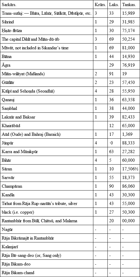 The revenue of the countries now held by me (935 AH. -1528 AD.) from Bhīra to Bihār is 52 krūrs,1907 as will be known in detail from the following summary.1908 Eight or nine krūrs of this are from parganas of rāīs and rājas who, as obedient from of old, receive allowance and maintenance.