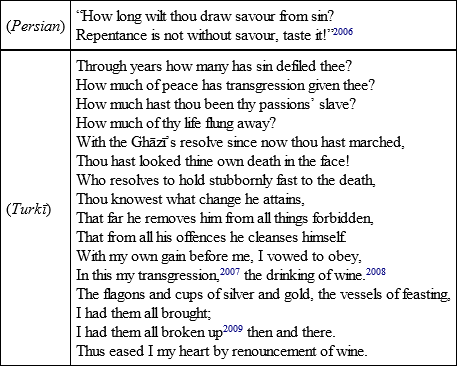 Our motive for these remarks and for repeating these statements is that, by reason of human frailty, of the customs of kings and of the great, all of us, from the Shāh to the sipāhī, in the heyday of our youth, have transgressed and done what we ought not to have done. After some days of sorrow and repentance, we abandoned evil practices one by one, and the gates of retrogression became closed. But the renunciation of wine, the greatest and most indispensable of renunciations, remained under a veil in the chamber of deeds pledged to appear in due season, and did not show its countenance until the glorious hour when we had put on the garb of the holy warrior and had encamped with the army of Islām over against the infidels in order to slay them. On this occasion I received a secret inspiration and heard an infallible voice say “Is not the time yet come unto those who believe, that their hearts should humbly submit to the admonition of God, and that truth which hath been revealed?”2019 Thereupon we set ourselves to extirpate the things of wickedness, and we earnestly knocked at the gates of repentance. The Guide of Help assisted us, according to the saying “Whoever knocks and re-knocks, to him it will be opened”, and an order was given that with the Holy War there should begin the still greater war which has to be waged against sensuality. In short, we declared with sincerity that we would subjugate our passions, and I engraved on the tablet of my heart “I turn unto Thee with repentance, and I am the first of true believers”.2020 And I made public the resolution to abstain from wine, which had been hidden in the treasury of my breast. The victorious servants, in accordance with the illustrious order, dashed upon the earth of contempt and destruction the flagons and the cups, and the other utensils in gold and silver, which in their number and their brilliance were like the stars of the firmament. They dashed them in pieces, as, God willing! soon will be dashed the gods of the idolaters, – and they distributed the fragments among the poor and needy. By the blessing of this acceptable repentance, many of the courtiers, by virtue of the saying that men follow the religion of their kings, embraced abstinence at the same assemblage, and entirely renounced the use of wine, and up till now crowds of our subjects hourly attain this auspicious happiness. I hope that in accordance with the saying “He who incites to good deeds has the same reward as he who does them” the benefit of this action will react on the royal fortune and increase it day by day by victories.