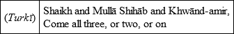 (June 7th) On Tuesday (Shawwāl 1st) we made the Prayer of the Festival, at dawn rode on, did 10 kurohs (20 m.), and dismounted on the bank of the Gūī (Gūmtī), a kuroh (2 m.) from Māīng.2658 The sin of ma‘jūn was committed (irtikāb qīlīldī) near the Mid-day Prayer; I had sent this little couplet of invitation to Shaikh Zain, Mullā Shihāb and Khwānd-amīr: —