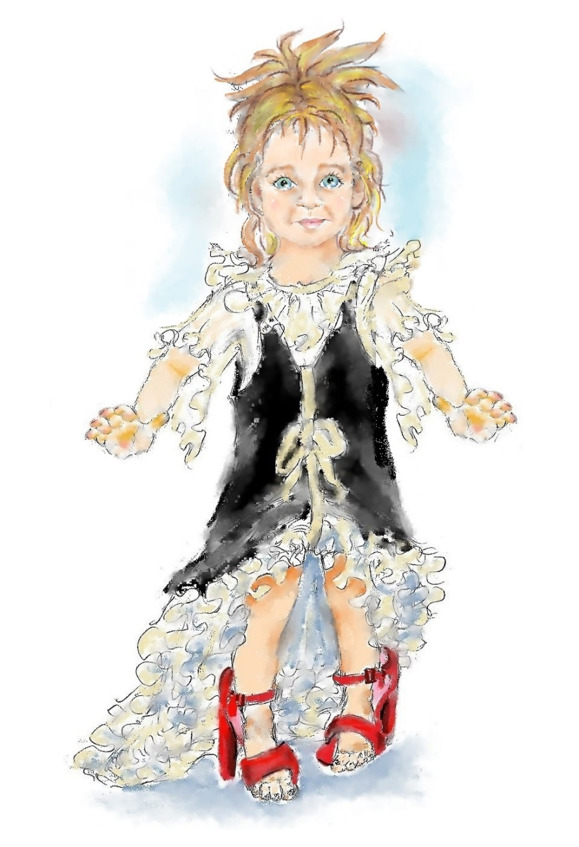 Тут из соседней комнаты притопала младшая сестра Кирилла Антошка. В мамином вечернем платье, подвязанном так, чтоб можно было ходить не наступая на него, растопырив ручонки для равно-весия, в туфлях на высоком каблуке, припадая то на одну ногу то на другую, из которых ее маленькая ножка вылазила через отверстие в области пальцев почти на половину, (по той простой причине, что туда могли бы поместиться минимум еще две ее ножки), с прической, как будто вороны гнездо свили и с полной уверенностью в том, что такой красоты нигде больше в мире не найти. В чем она несомненно была права.