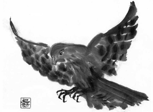 He watched a sparrow hawk, soaring over the meadow near the cooling towers. It hovered with fluttering wings, then closed them and stooped. Just above the short grass it spread its wings, leveled off from its dive, and then, its talons spread in front, pushed among the thick stems.