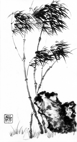 He began to draw heavy jagged broken lines from the center of the picture toward the lower right edge. The shape of a cliff, or rather a large slender stone, leaning into the picture toward the left, seeming to grow gradually from the ground. The side of the almost dry brush wiped rough scratches in a seemingly hard surface. Now the three bamboo shoots stood in front of a stone, which seemed to have emerged at their feet.