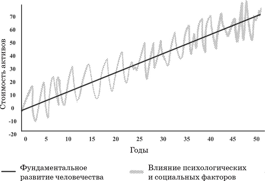 Уже упомянутый мной основатель фундаментального анализа и стоимостного инвестирования Бенджамин Грэм любил говорить: «В краткосрочной перспективе рынок – это машина для голосования, в долгосрочной – весы». Таким образом он подчеркивал, что при краткосрочном горизонте на цены активов влияют социальные факторы и человеческие пороки, такие как жадность или страх, а в долгосрочной перспективе существенными становятся действия экономических законов, развитие технологий, рост бизнеса и т. д. Если схематично изобразить этот принцип, то он выглядел бы, как показано на рисунке ниже, где прямая изображает фундаментальные факторы, а волнистая линия – человеческие представления о ценности.