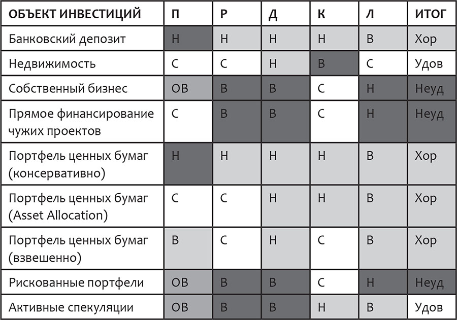 Посмотрите на таблицу, которую я называю «зачетка инвестора». Она наглядно демонстрирует плюсы и минусы различных видов инвестиций. Разобраться в ней легко.