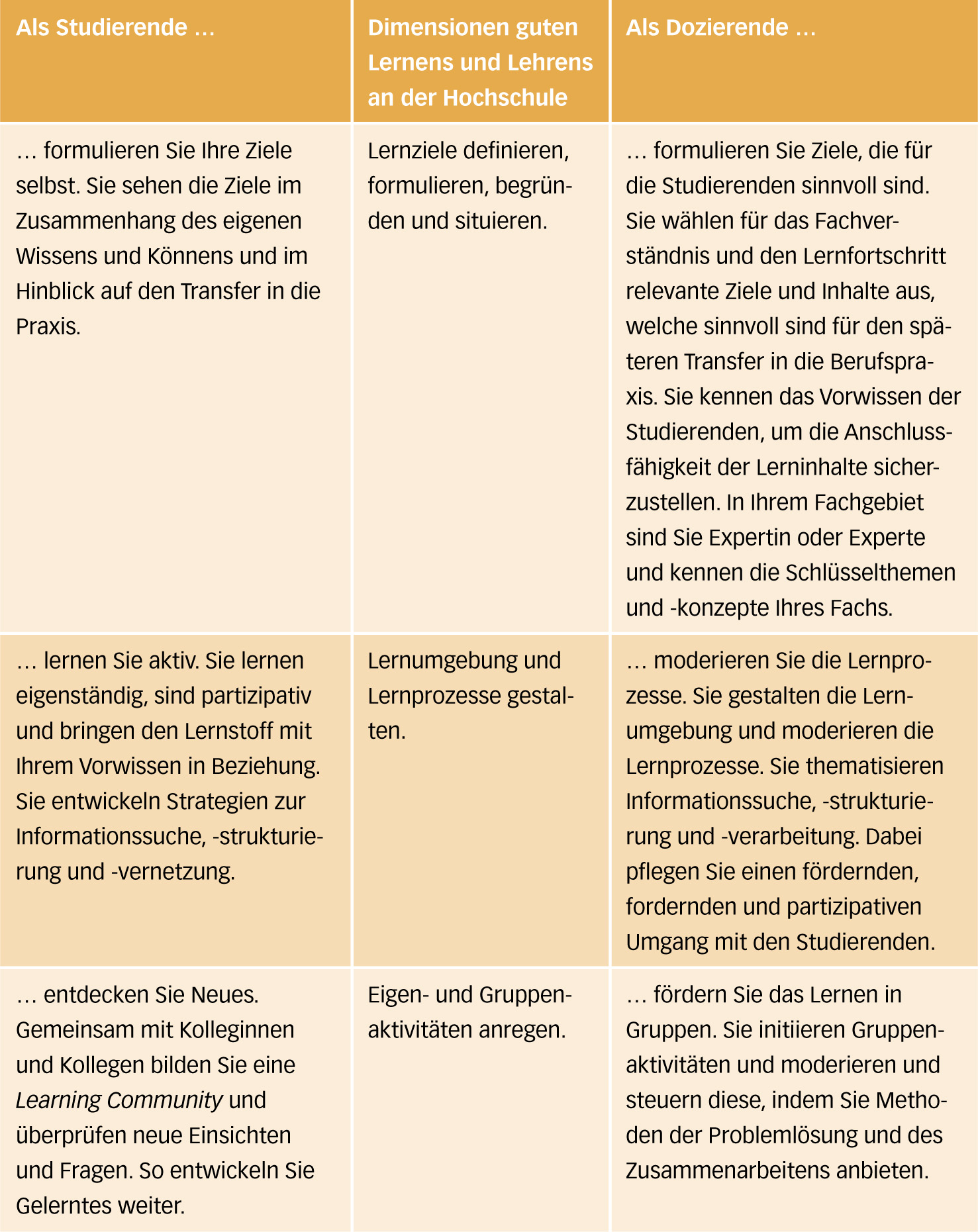Abb. 8 Vorlage für Faltprospekt mit Dimensionen guten Hochschullernens und -lehrens mit Erwartungen an Dozierende und Studierende (Bachmann 2006).