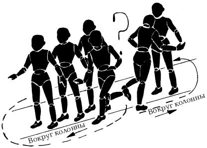 Впереди колонны – водящий. По команде водящего последняя пара разъединяет руки и бежит вперед: один по правую, другой по левую сторону колонны.
