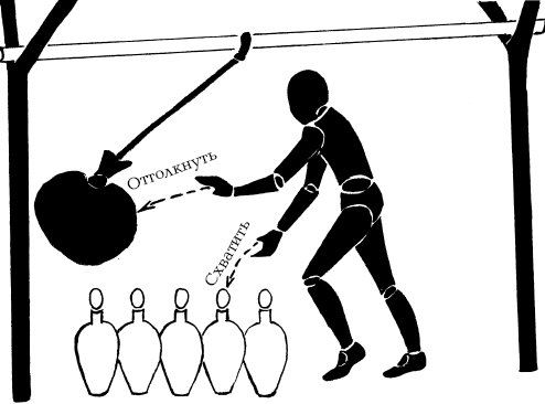 Медвежья западняМежду двумя деревьями укрепляют перекладину и подвешивают на веревке большой мешок, набитый соломой или сухими листьями. На земле под мешком устанавливают кегли или чурки. Медведь должен оттолкнуть мешок и успеть схватить одну или несколько чурок раньше, чем он вернется обратно. За каждую кеглю засчитывают по одному очку.