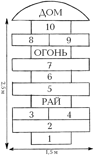 Таким образом можно пройти все классы. Можно добавить к прямоугольникам полукруг или другую фигуру (дом, рай, огонь), в которой по условию можно будет встать на обе ноги (например, дом или рай), или напротив, перепрыгнуть ее, не оставляя в ней биту (огонь).