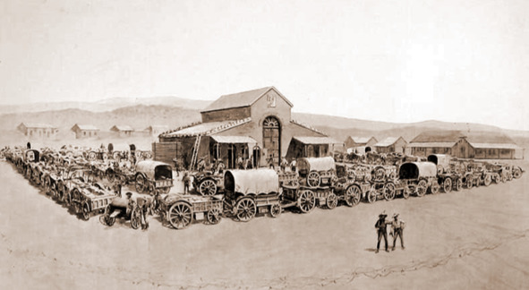 Рыночная площадь в Булавайо, окруженная фургонами (колючая проволока появится позже)