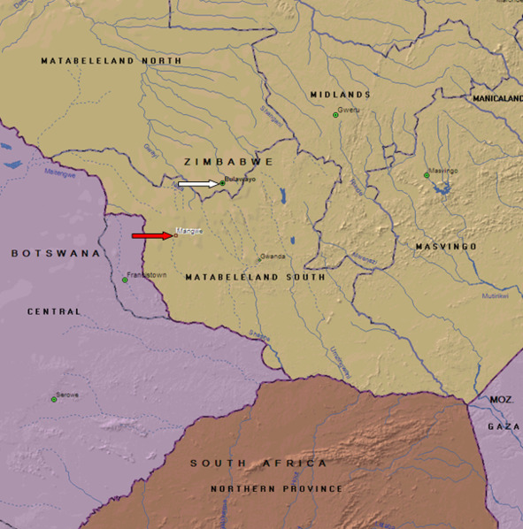 Мангве (красная стрелка) и Булавайо (белая стрелка) на современной карте