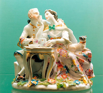 Mitglieder der Freimaurerloge des „Mopsordens“ als Liebespaar. Porzellan, Meißen, um 1745. Modelleur: Johann Joachim Kaendler (1706–1775). Im 19. Jahrhundert sollte dann eine regelrechte Mopsmanie ausbrechen.