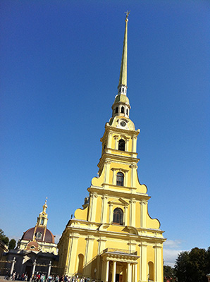 Die Peter-Paul-Kathedrale, entworfen 1712 von dem Tessiner Architekten Domenico Trezzini im Auftrag Peters des Großen. Nach Peters Tod im Jahr 1725 wurde die Kathedrale die letzte Ruhestätte der Zaren.