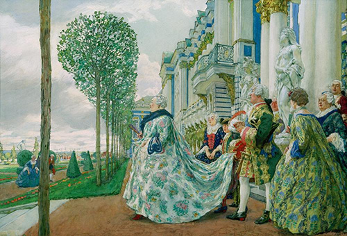 Elisabeth Petrowna, Zarin von Rußland (1741–62) in Zarskoje Selo. Illustration, 1905, von Jewgeni Jewgenjewitsch Lancerai (Lansere) (1875–1946).