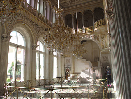 Der Pavillonsaal, einer der Prunkräume im Winterpalast von Sankt Petersburg. Damals war er noch ganz in Gold und aus weißem Marmor. In ihm befindet sich auch die berühmte Pfauenuhr des Engländers James Cox, die einmal Potemkin gehört hatte.