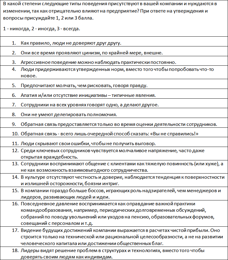 Саймон Долан, Сальвадор Гарсия в книге «Управление на основе ценностей. Корпоративное руководство по выживанию, успешной жизнедеятельности и умению зарабатывать деньги в XXI веке» рассказыват о факторах, указывающих на необходимость культурного преобразования. Сколько факторов «культурной безжизненности», перечисленных ниже, наблюдается в вашей компании?