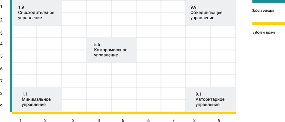 В теории часто можно встретить мысль о том, что лидер концентрируется на людях, тогда как менеджер – на задачах. «Управленческая матрица» Блейка и Мутона является классическим и до сих пор популярным примером универсального подхода. Матрица постулирует два фундаментальных измерения эффективности лидера: забота о задаче и забота о людях. Теоретически матрица содержит 81 ячейку, однако Блейк и Мутон придают особое значение лишь пяти: