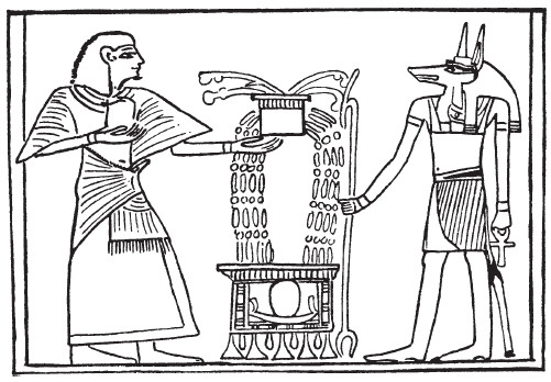 Рис. 3. Писец Ани, держащий ожерелье с пекторалью, на котором изображена ладья Ра со скарабеем, или жуком, в присутствии Анубиса, бога мертвых. (Из папируса Ани, лист 15)