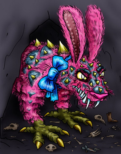 То ли шелковистый розовый мех, покрывающий чудовище плотным волнистым ковром, наводил его на эту мысль. То ли золотые шипы на тупой морде, украшенной серебристой эмалью. То ли цветочный орнамент по краям длинных заячьих ушей. То ли атласный голубой бант на шее. То ли алмазные клыки.