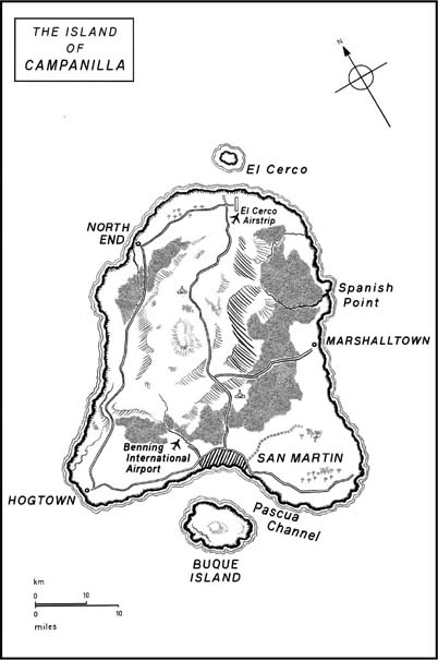 The fold-out map at the back of the handbook showed that the island really was bell-shaped. The lower rim of the bell was scooped out in a huge bay and the clapper was formed by Buque Island, separated from the main island by Pascua Channel. Opposite Buque Island was the capital of San Martin. Two misshapen peninsulas on opposite coasts represented the trunnions by which the bell would be hung. Northwards, at the top of the ‘bell’, was a coral formation, almost atoll-like, forming a perfect ring called El Cerco, which represented the ring to which the bell rope would be attached. Nature was imitating art in a big way.
