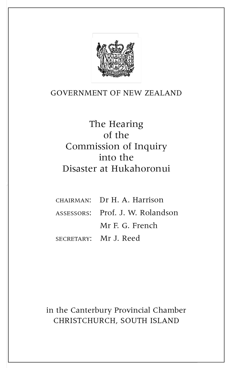‘In the winter of the year, on the eighteenth of July, a disaster occurred in the township of Hukahoronui on the South Island of New Zealand in which fifty-four people lost their lives. The New Zealand Government has appointed a Commission of Inquiry, of which I am Chairman. My name is Arthur Harrison and I am Rector of Canterbury University.’