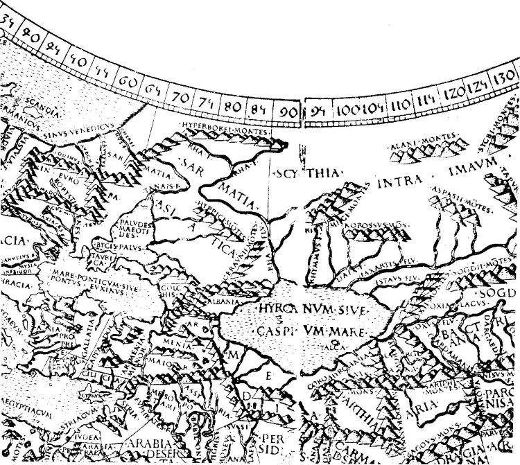 Что же касается географического облика карты, то земля, расположенная к северу от Понта Эвксинского (Черного моря), слишком сильно вытянута по широте. Протяженность всей Сарматии по долготе (т. е. от северного побережья Черного моря до Северного океана) соотносится с шириной Черного моря как 1:22. Аналогичным образом протяженность Меотийского озера (Азовского моря) с севера на юг соотносится с его шириной как 1:12. В результате расстояния оказались сильно искаженными – например, расстояние между г. Фаниакориум и побережьем современного Крыма равно длине самого Меотийского озера (Фанагория, древнегреческая колония, располагалась недалеко от того места, где сейчас стоит г. Тамань на берегу Таманского залива, напротив Керчи).
