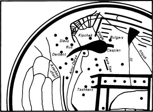 Одной из схематических карт этого типа является карта аль-Каш-гари (рис. 4), на которой изображены обширные территории Центральной Азии, включая Китай. Она была создана еще до того, как тюрки начали свое движение на запад и занимали пока только территорию Центральной Азии. Кроме названий, имеющихся в исламских атласах, мы находим печенегов к западу от Каспия, баскертов (башкир) далеко на восток от него и кипчаков к западу от Волги.