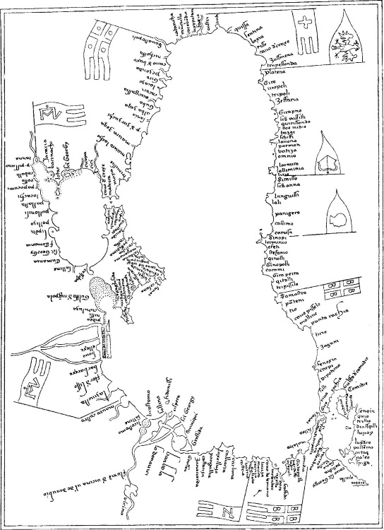 Рис. 7. Карта Черного моря Петра Весконте, перерисованная Кречмером [Kretschmer, 1891] из Codex Vaticanus (Сборник документов Ватикана) № 2972