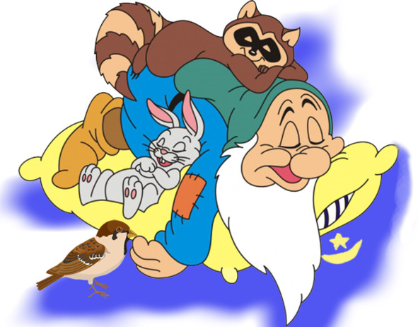 Прочитал гном мальчишкеРазноцветную книжку:О лисе и зайчишке,О коричневом мишке.О смешном попугае,Что детишек пугает.Засыпает мальчишка.Закрывается книжка.Спит коричневый мишка.Спит лиса и зайчишка.Спит смешной попугайчик.Гномик прячется в шкафчик.