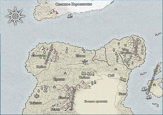 Так покружили на западе Нагата, потом двинулись в сторону Снежного Королевства, но суровая в тех местах зима заставила вернуться. Об этом особо никто не жалел. Рума там уже бывал и ничего интересного для себя не нашел. Эндиус, который рвался в новые места, как самый молодой и мало видавший другие страны, не любил морские путешествия, а тем более по бушевавшему в это время года Крестовому морю. Дюмана тянуло в Кайгу, по этому поводу в отряде шутили, что тот женится раньше всех остальных. Акану было безразлично, куда держать путь, лишь бы были приключения. А Дарин и Стам во всём были согласны с магом и принцем. Так что, снова пройдя по западной части Нагата, отряд двинулся на юг.