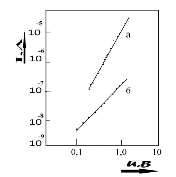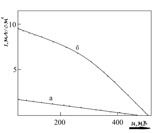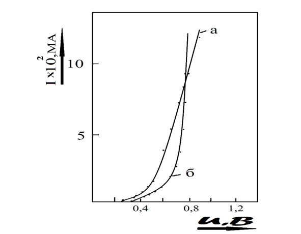 Рис. 1 Прямые ветви ВАХ Cu2-xTe-CdTe солнечных элементов до (а) и после (б) ТО