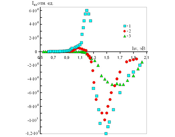 Рис.1.Спектральные зависимости Iкз для структуры CdTe-SiO2-Si от величины потенциала коронного разряда: jкр =80 В (кривая 1), 50 В (2),0 В (3).