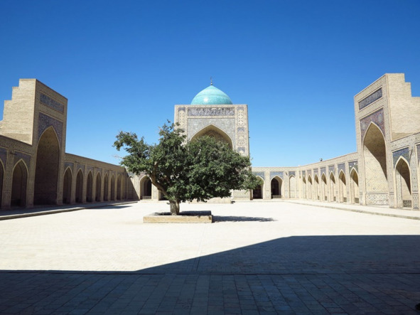 Последнее здание соборной Мечети Калян («Масҷид-и калон») завершено в 1514 г. Оно равно по масштабу зданию мечети Биби-Ханым в Самарканде. Под её сводами собиралось до 12 тысяч человек. При едином типе здания – это совершенно различные произведения зодческого искусства. Прямоугольный двор обрамлён галереями, состоящими из 288 куполов. Основанием им служат 208 колонн. Продольная ось двора завершается «максурой» – портально-купольным объёмом здания с крестообразным залом, над которым возносится голубой массивный купол на мозаичном барабане. Здание хранит много любопытных архитектурных находок. Например, круглое отверстие в одном из куполов. Внизу, через него можно видеть основание минарета Калян. А отступая шаг за шагом, можно сосчитать все пояса узорной кладки минарета и упереться взором в его ротонду.