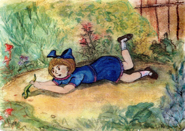Вот и сейчас Алеся заприметила на обочине красивую верёвочку зеленовато-жёлтого цвета. Чтобы получше её рассмотреть, Алеся подошла поближе. Из-под ног юркнула маленькая ящерка и спряталась в кустах.