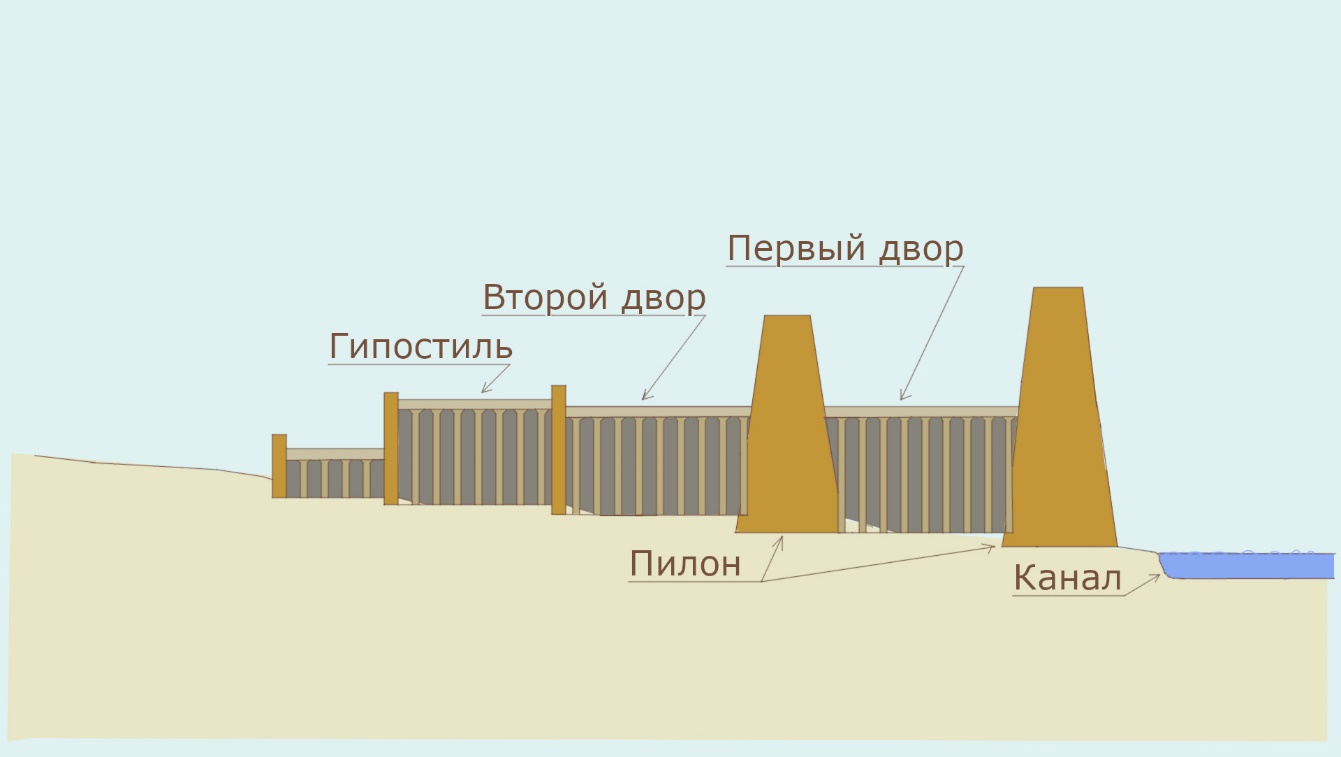 Имеется два варианта конфигураций древнеегипетских комплексов. Первая схема – это канал-пристань-храм с пилонами. Вторая разновидность – канал-пристань-храм с пирамидой.