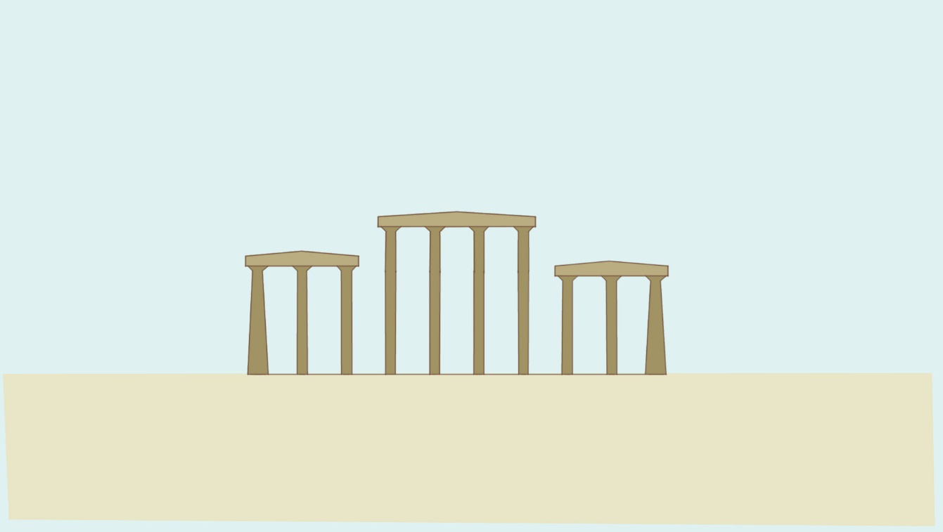 На этом же изображении показан портик с двумя рядами колонн. Крыша опирается на стену и две линии столбов. Рисунок является примерным и служит только для пояснения текста. Назначение графики – понять суть рассматриваемого вопроса. В данном конкретном случае ставилась задача – выяснить, из каких основных элементов состоял двор древнеегипетского храма.